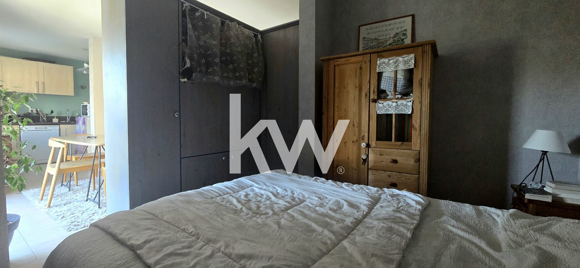 • Une chambre a été aménagée dans le séjour grâce à une cloison en claustra bois (amovible, à conserver ou retirer selon vos besoins).