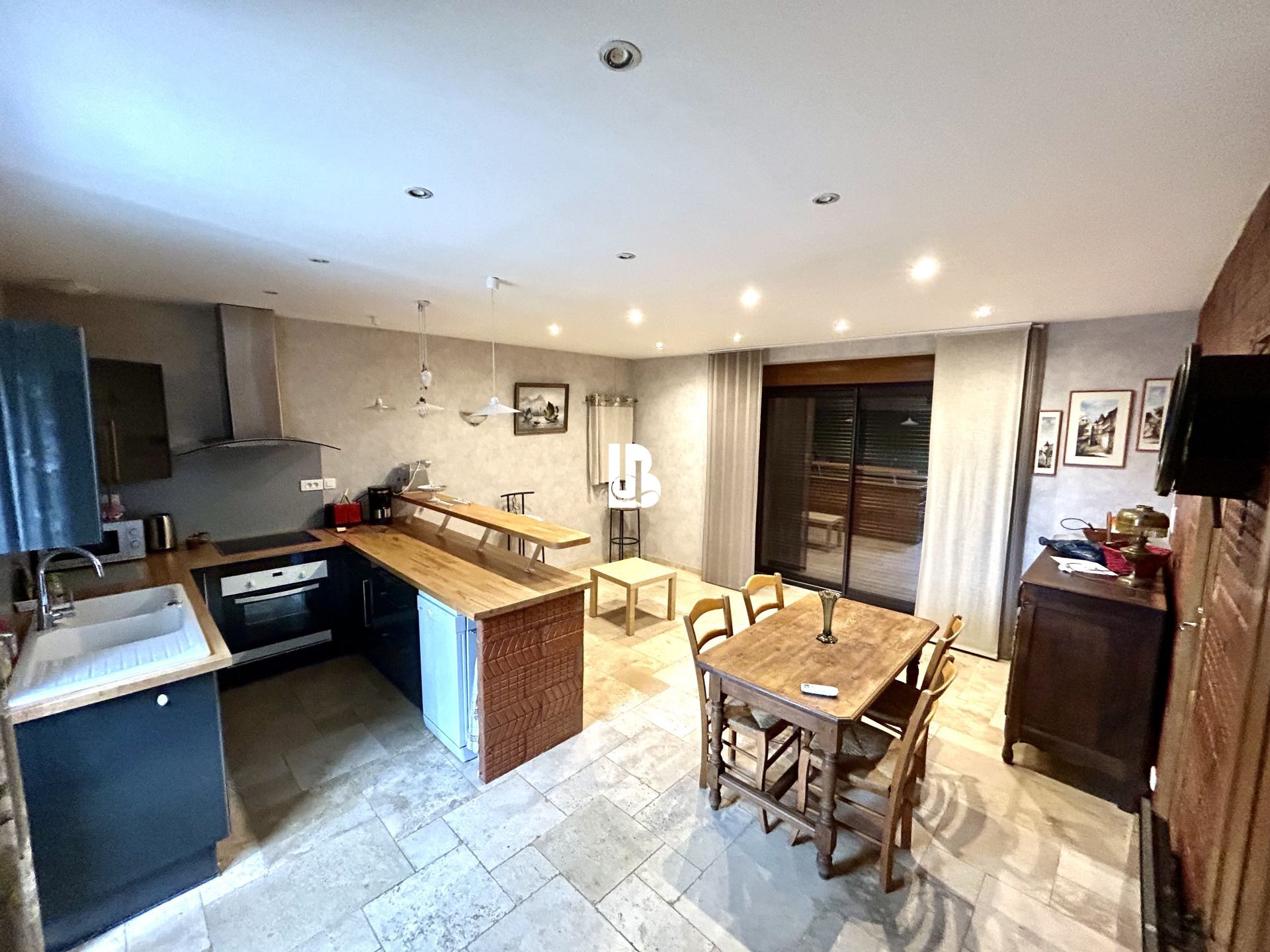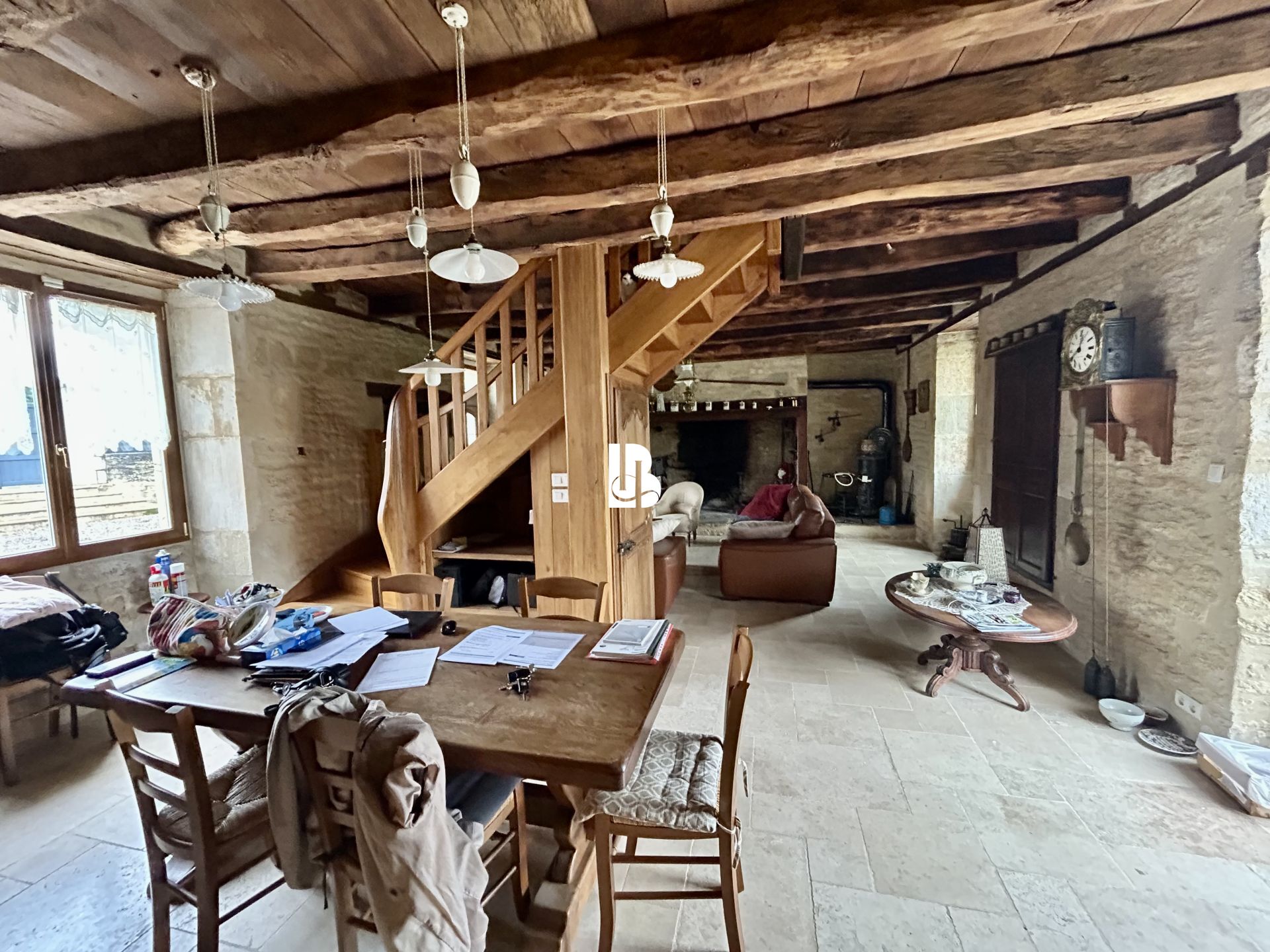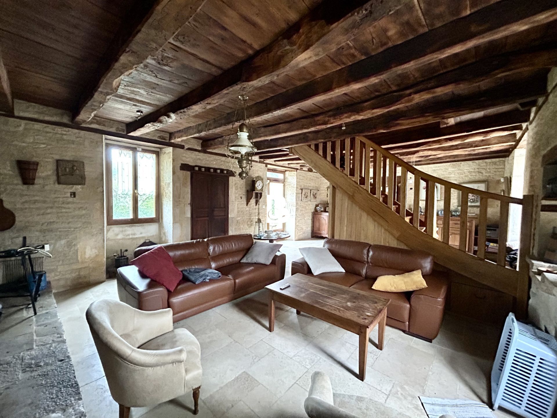 La maison principale offre au rez-de-chaussée une entrée, un vaste séjour avec cheminée et poêle à bois ouvrant sur une terrasse ensoleillée, une cuisine équipée, salle d’eau et toilettes séparées.