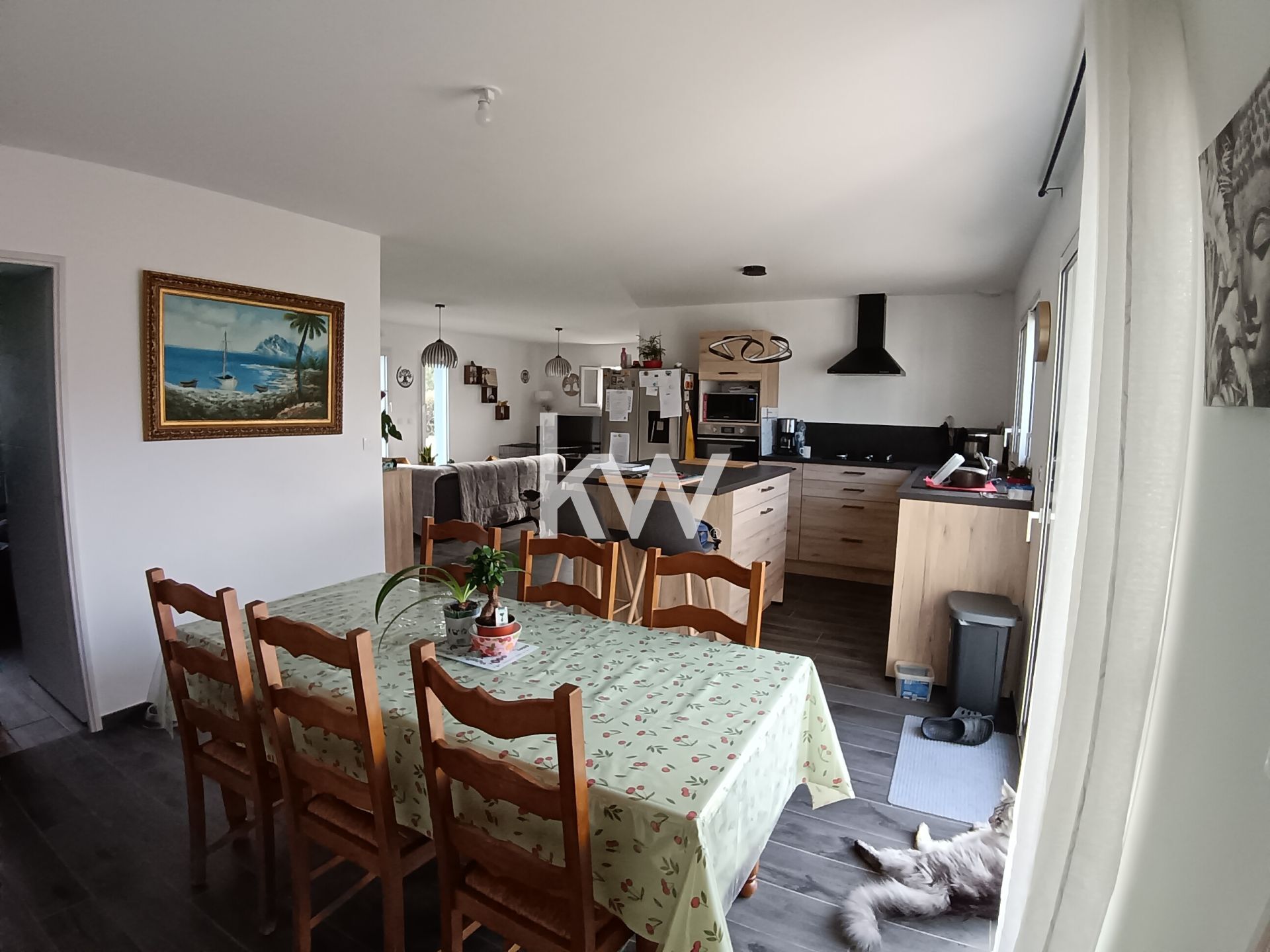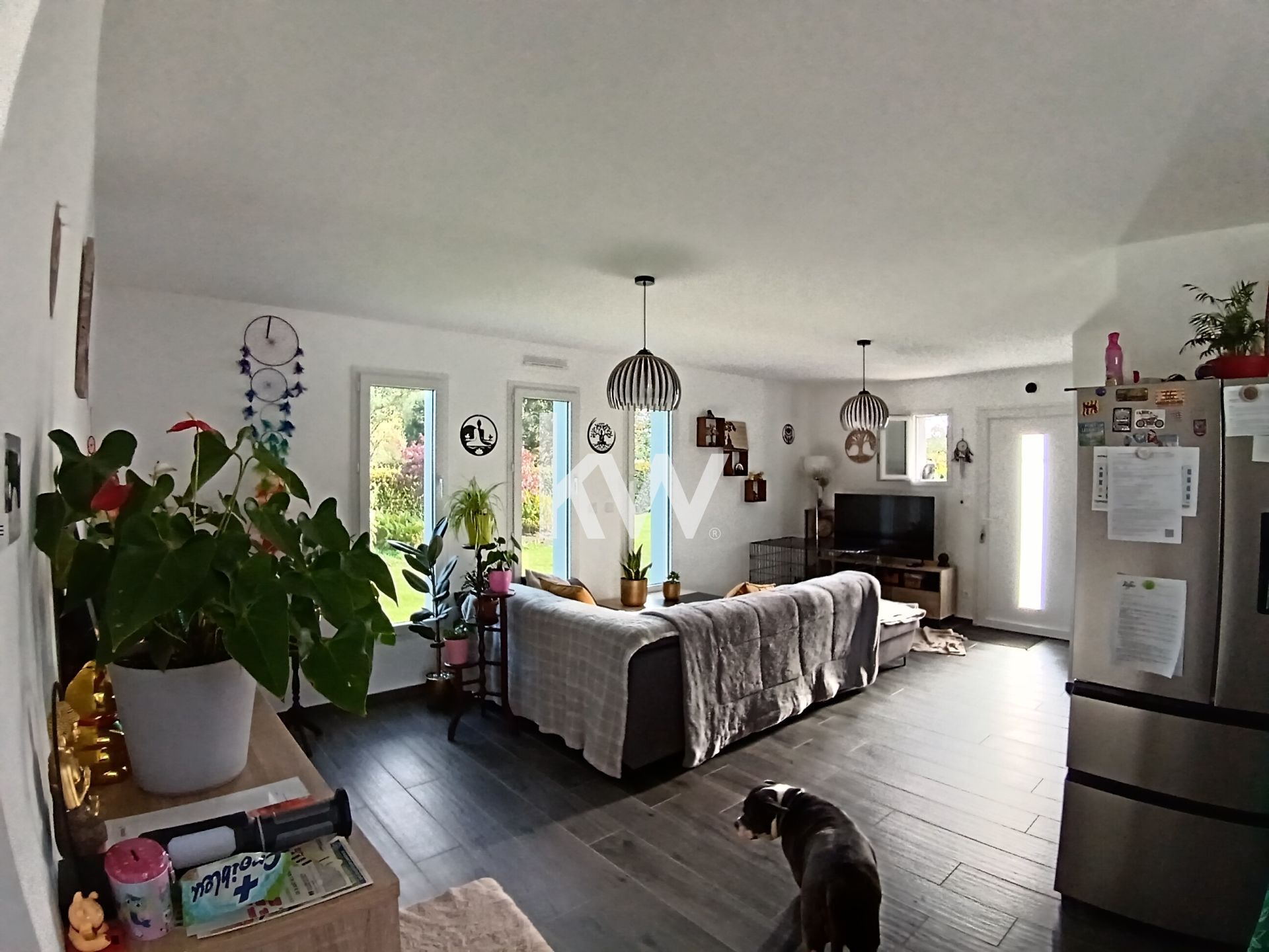Une entrée, une grande pièce de vie, une cuisine ouverte aménagée et équipée.
