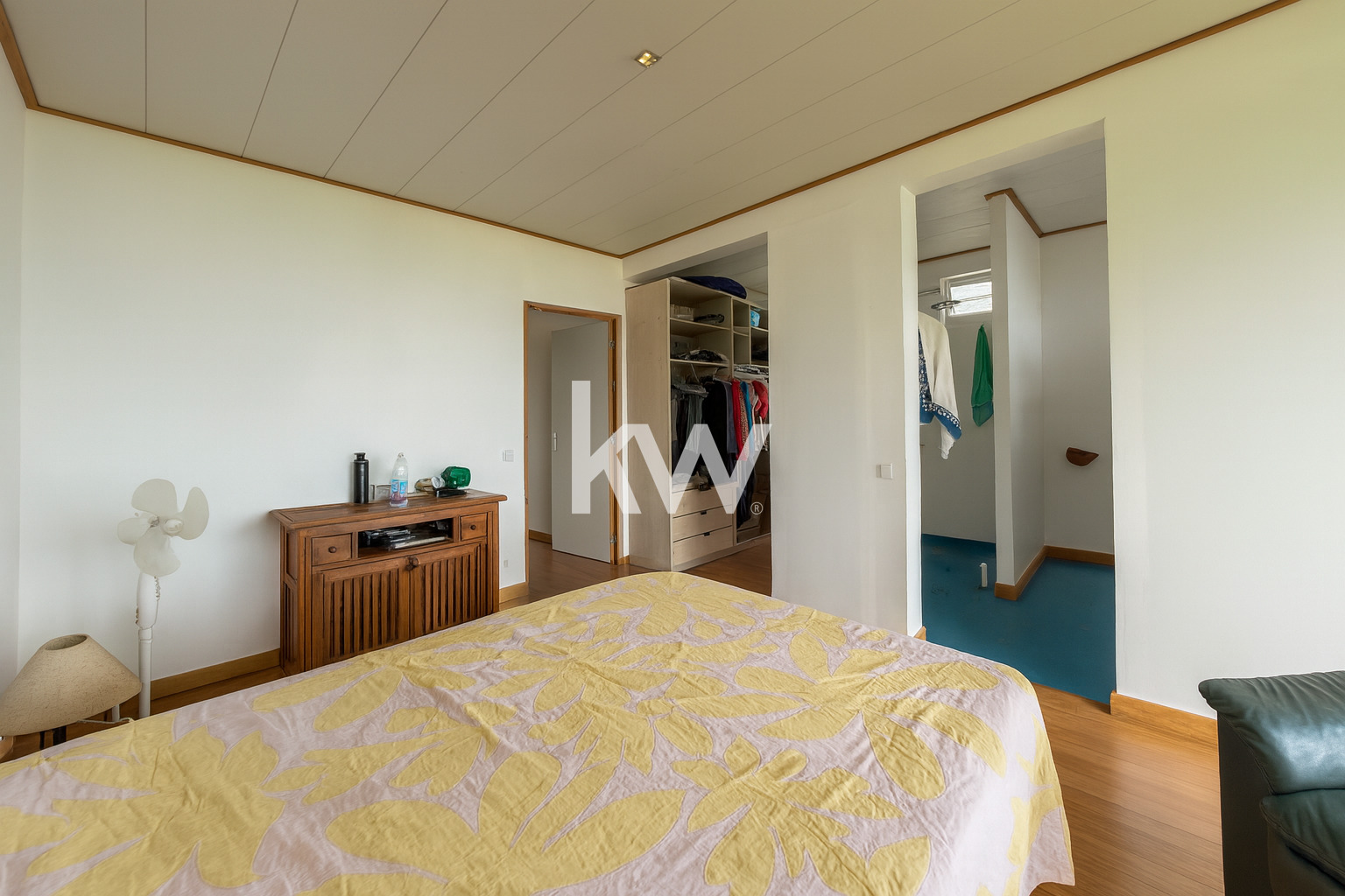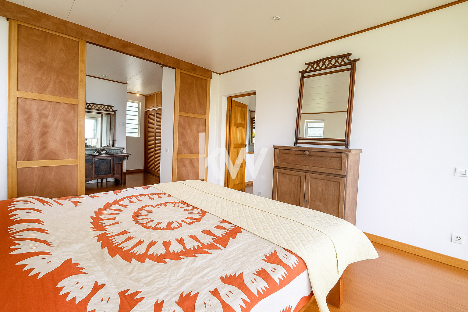 Les pièces de vie, ouvertes et traversantes, se prolongent sur une terrasse filante de 24m² offrant une belle vue sur la mer et Tahiti Nui.